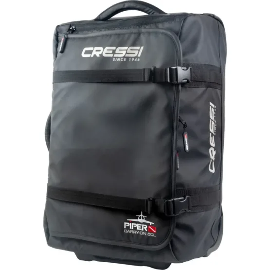 • Bolso Cressi modelo Piper, peso 2,9 kg y 4,9 litros de capacidad. Sus dimensiones cumplen normativa de equipaje de mano en aviones: 35,5 x 23 x 56 cm.